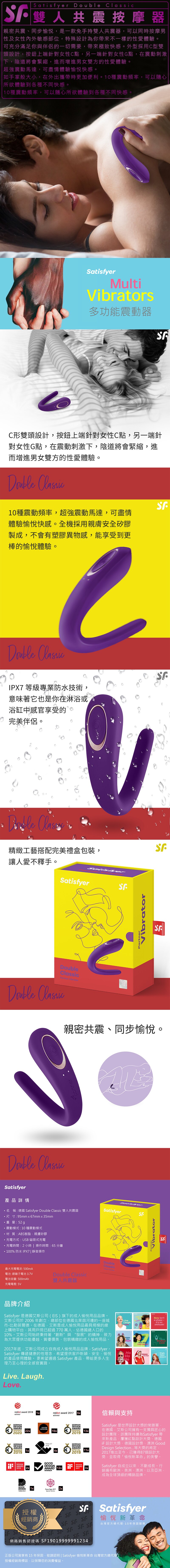 親密共震、同步愉悅。德國Satisfyer Double Classic 雙人共震器,是一款免手持雙人共震器,可以同時按摩男性及女性內外敏感部位,特殊設計為你帶來不一樣的性愛體驗。