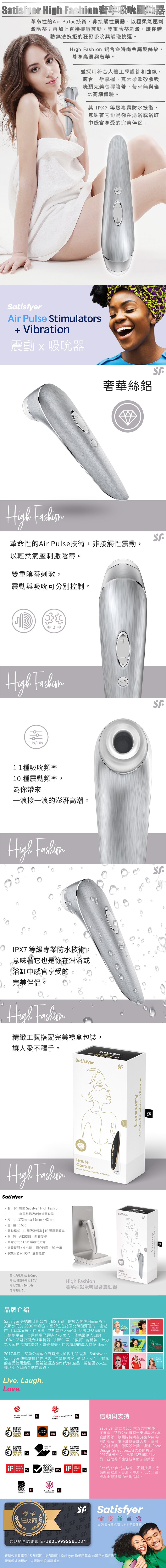 德國Satisfyer High Fashion 奢華絲鋁吸吮陰蒂震動器,革命性的Air Pulse技術,非接觸性震動,以輕柔氣壓刺激陰蒂;再加上直接接觸震動,雙重陰蒂刺激,讓你體驗無法抗拒的狂野吸吮與觸碰挑逗。