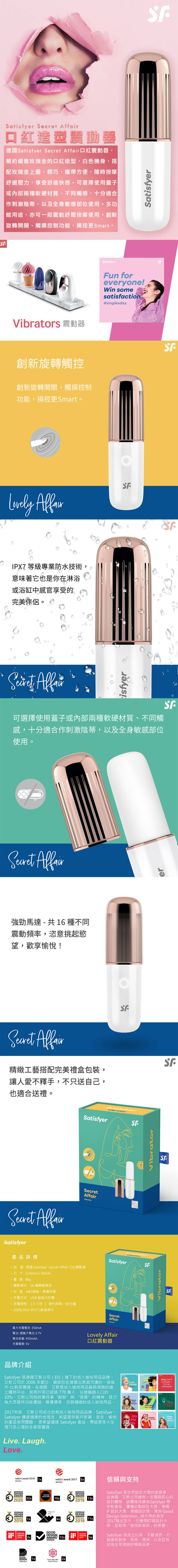 德國Satisfyer Secret Affair 口紅震動器,簡約優雅玫瑰金的口紅造型 ,白色機身,搭配玫瑰金上蓋,輕巧、攜帶方便,隨時按摩紓緩壓力,享受舒適快感。