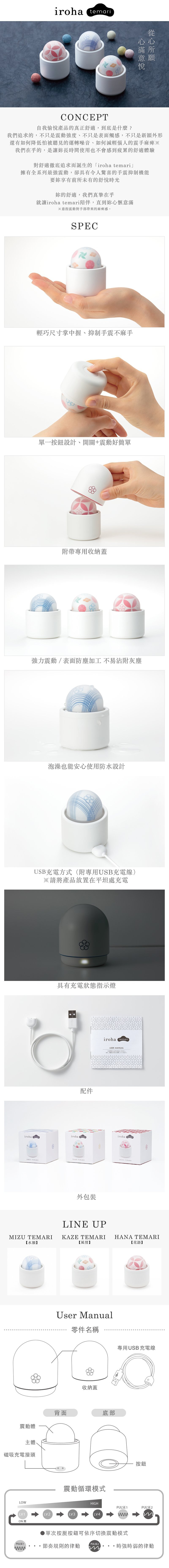 在外型上,「iroha temari」承襲一貫的和風元素,以日本傳統工藝童玩-手毬(亦稱手鞠、鞠球)為發想所設計,造型輕巧如手掌般大小,成人用品新手也能輕鬆掌握上手。