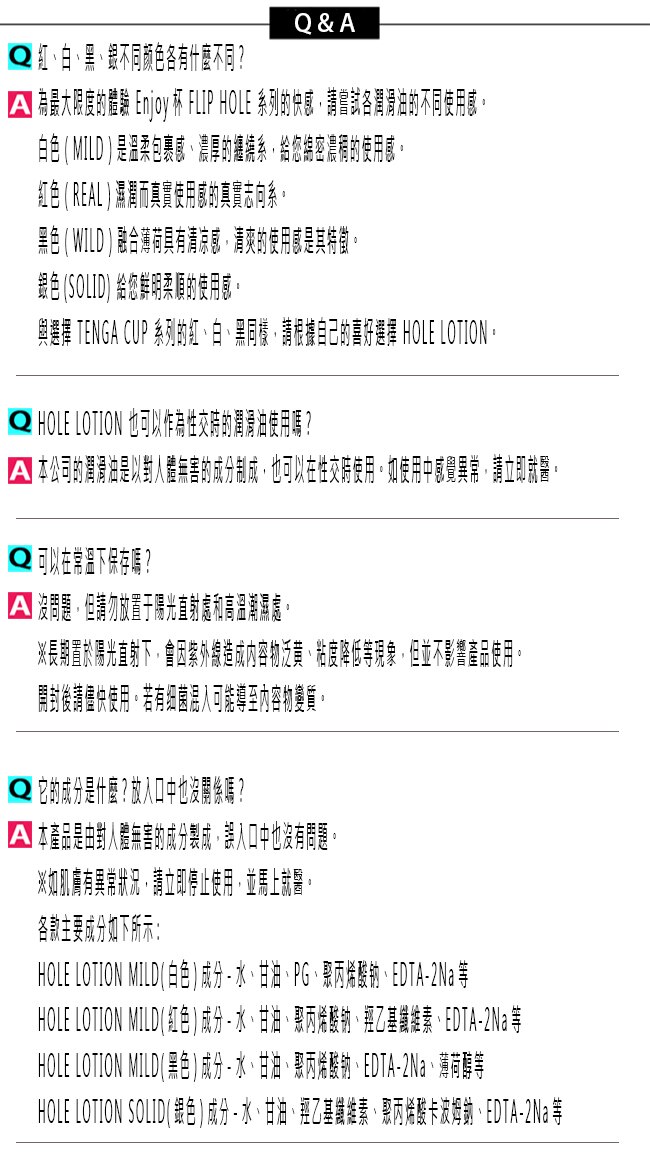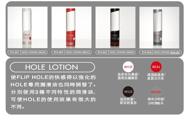 為能最大限度的享受Enjoy杯 FLIP HOLE的快感,TENGA同時開發了HOLE專用的潤滑油。準備了4種不同特性的潤滑油。不同的潤滑油,使用感會發生巨大變化。請根據自身的喜好選擇。